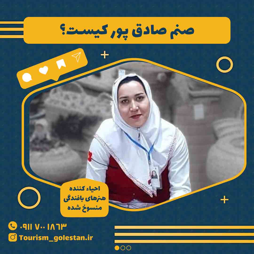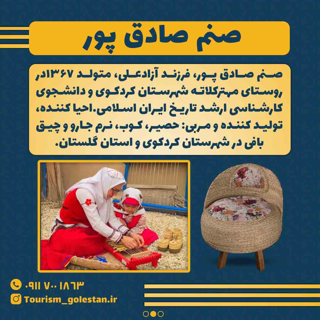 صنم صادق پور یکی از این کار آفرینان موفق و احیاء کننده، تولید کننده و مربی : حصیر-کوب-نرم جارو و چیق بافی در استان گلستان و اهل روستای مهترکلاته بود که با امکانات کم توانسته درحیاط منزلش به کار آفرینی بپردازد و صنایع دستی فراموش شده حصیر بافی جیق بافی و نرم جارو را زنده کند.