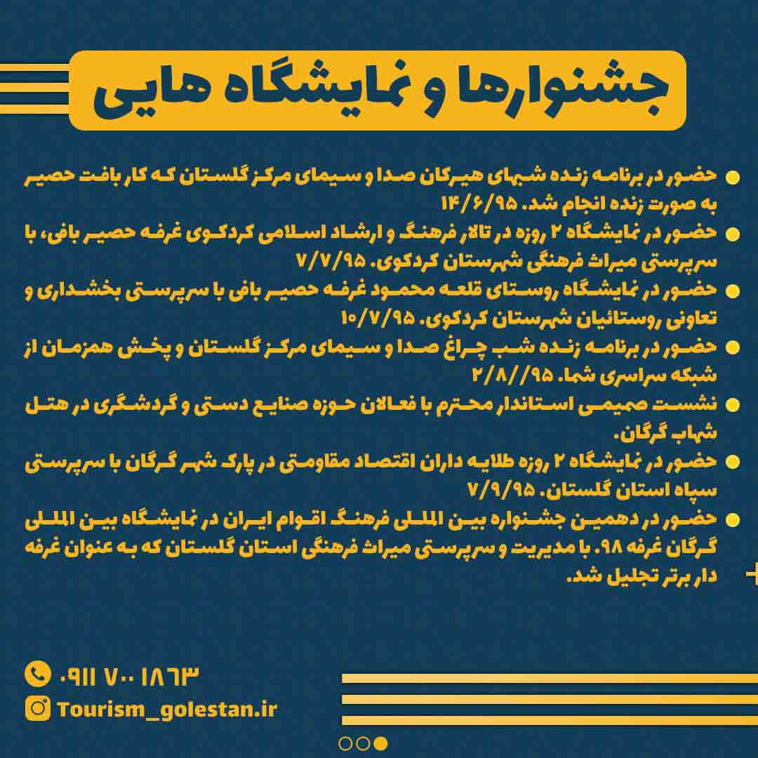 حضور در دهمین جشنواره بین المللی فرهنگ اقوام ایران در نمایشگاه بین المللی گرگان غرفه 98. با مدیریت و سرپرستی میراث فرهنگی استان گلستان که به عنوان غرفه دار برتر تجلیل شد.