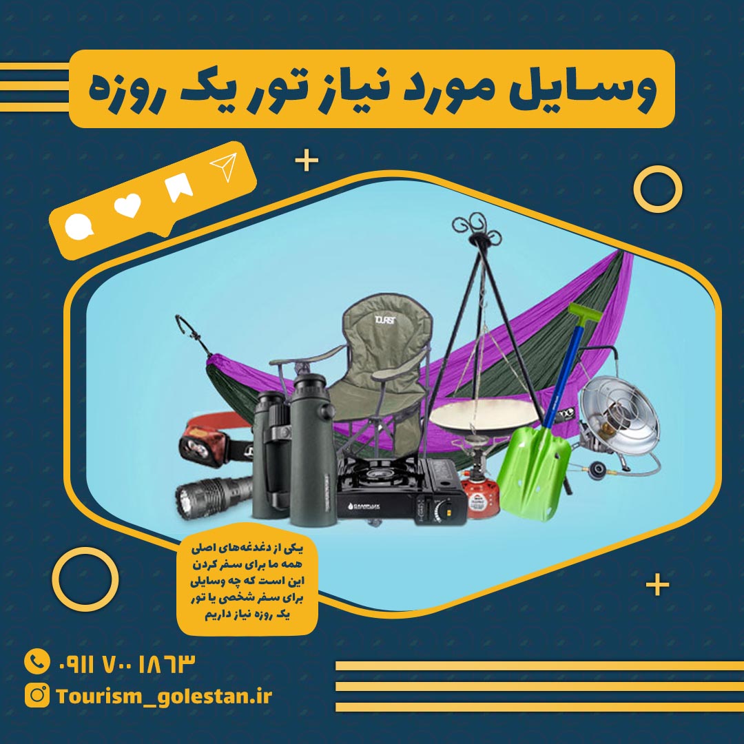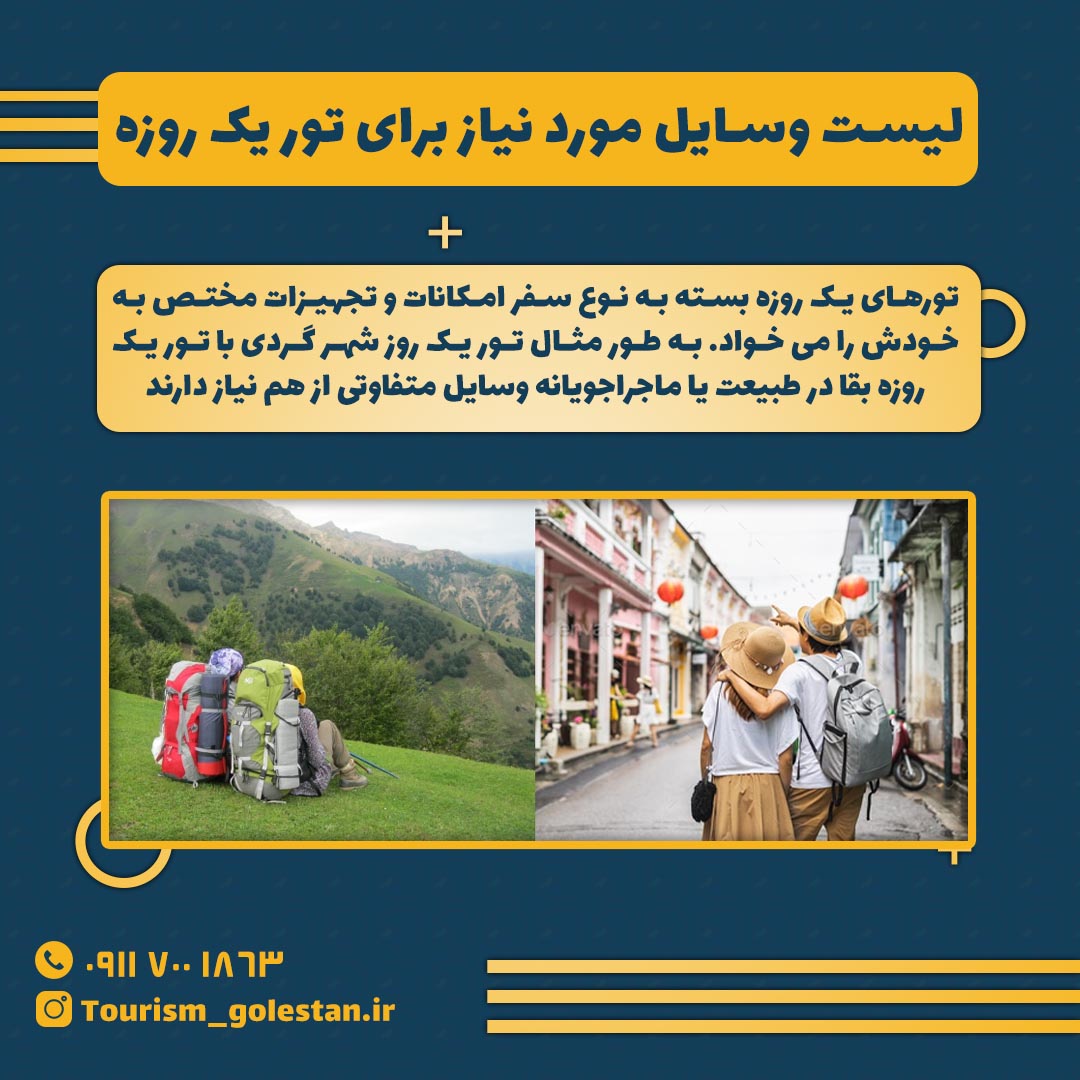 تورهای یک روزه بسته به نوع سفر امکانات و تجهیزات مختص به خودش را می خواد. به طور مثال تور یک روز شهر گردی با تور یک روزه بقا در طبیعت یا ماجراجویانه وسایل متفاوتی از هم نیاز دارند