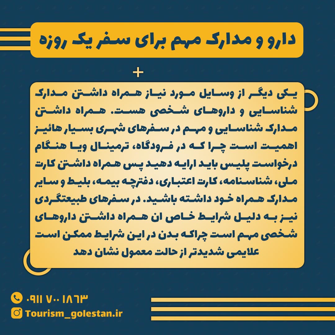 یکی دیگر از وسایل مورد نیاز همراه داشتن مدارک شناسایی و داروهای شخصی هست. همراه داشتن مدارک شناسایی و مهم در سفرهای شهری بسیار هائیز اهمیت است چرا که در فرودگاه، ترمینال ویا هنگام درخواست پلیس باید ارایه دهید پس همراه داشتن کارت ملی، شناسنامه، کارت اعتباری، دفترچه بیمه، بلیط و سایر مدارک همراه خود داشته باشید. در سفرهای طبیعتگردی نیز به دلیل شرایط خاص ان همراه داشتن داروهای شخصی مهم است چراکه بدن در این شرایط ممکن است علایمی شدیدتر از حالت معمول نشان دهد