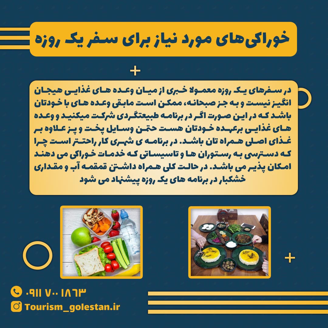 در سفرهای یک روزه معمولا خبری از میان وعده های غذایی هیجان انگیز نیست و به جز صبحانه، ممکن است مابقی وعده های با خودتان باشد که در این صورت اگر در برنامه طبیعتگردی شرکت میکنید و وعده های غذایی برعهده خودتان هست حتمن وسایل پخت و پز علاوه بر غذای اصلی همراه تان باشد. در برنامه ی شهری کار راحتتر است چرا که دسترسی به رستوران ها و تاسیساتی که خدمات خوراکی می دهند امکان پذیر می باشد. در حالت کلی همراه داشتن قمقمه آب و مقداری خشکبار در برنامه های یک روزه پیشنهاد می شود