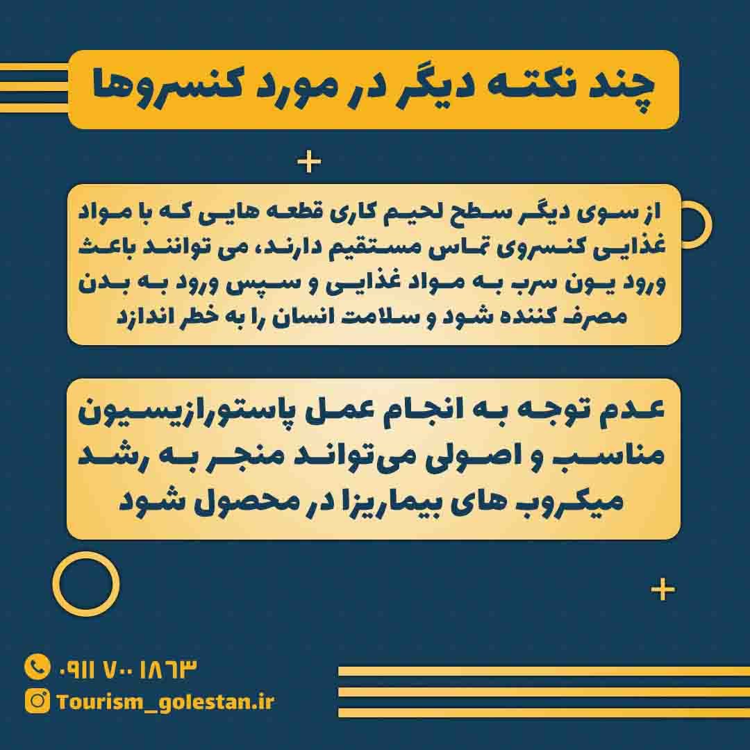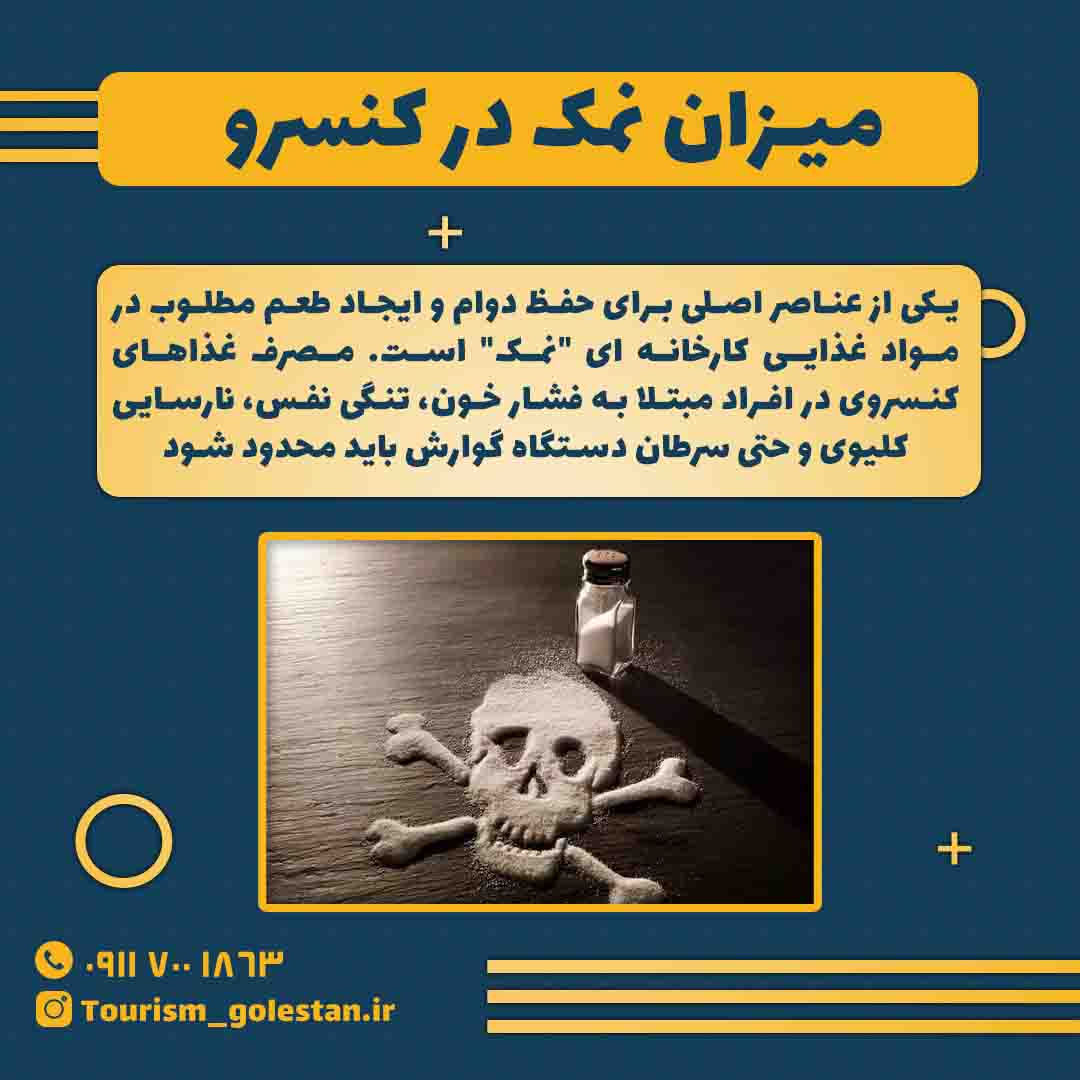یکی از عناصر اصلی برای حفظ دوام و ایجاد طعم مطلوب در مواد غذایی کارخانه ای “نمک” است. مصرف غذاهای کنسروی در افراد مبتلا به فشار خون، تنگی نفس، نارسایی کلیوی و حتی سرطان دستگاه گوارش باید محدود شود